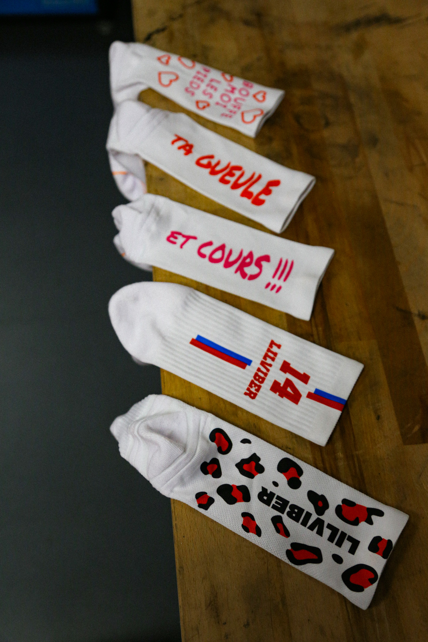 J’en ai des trucs personnalisés (de la paire de tennis à la petite culotte…), mais les chaussettes je n’y avais pas encore pensé. Et puis dans mes bottes de piste et sous ma « combar », je n’ai jamais sous-estimé l’impact que pouvait avoir une bonne paire de chaussettes, aussi bien sur le confort que sur leur longévité.